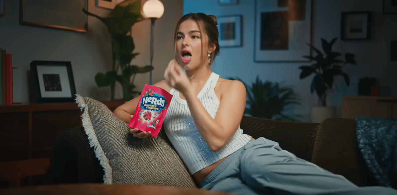 Nerds launches new product, the Gummy Clusters, with a Flashdance-inspired campaign, featuring TikTok and YouTube teasers where Addison Rae plays a dance instructor preparing a gummy nerd for its moment on stage. (Screenshot from the Nerds YouTube Channel)
